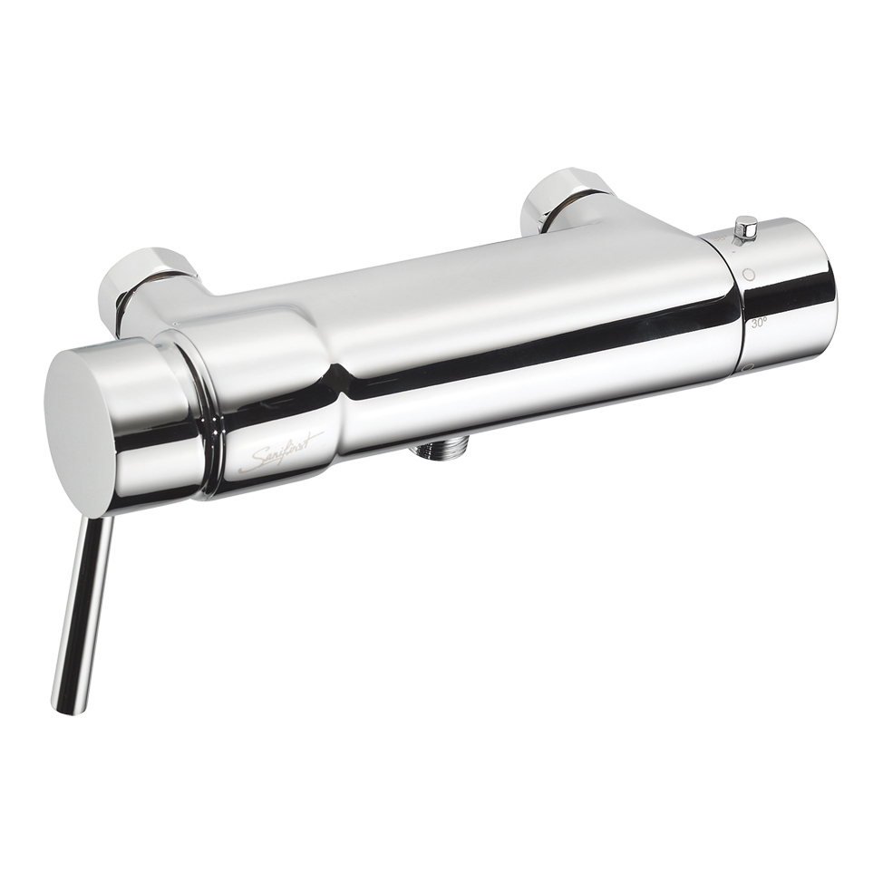 Cuerpo en latón cromado,piezas interiores en materiales resistentes a la corrosión. Apertura por palanca. Volante de temperatura con bloqueo a los 38º por golpe térmico. Desbloqueo por los servicios técnicos sin la necesidad de desmontar el volante. Cabeza cerámica ½ vuelta para el ajuste del caudal y cartucho termostático. Con regulador de temperatura de 18 a 38°. Cuerpo frío,aislamiento anti quemaduras.